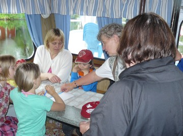 Arpa-asiakkaana Elina Ahlqvist pikkuväen kera. Kauppiaina Eeva Rantanen (selin) ja Sirkka Mäenpää.
